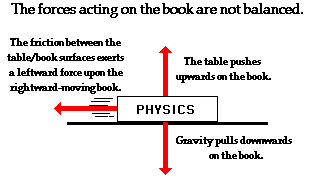 An object are always acted upon by two forces, that can be balanced or unbalanced. Balanced forces are when the forces being exerted on an object, by another, are equal to that of the forces it is exerting itself, eg; a book resting on a table is under the force of gravity, which is equal to the force of the table pushing upwards, thus leading onto the thrid law (see below).